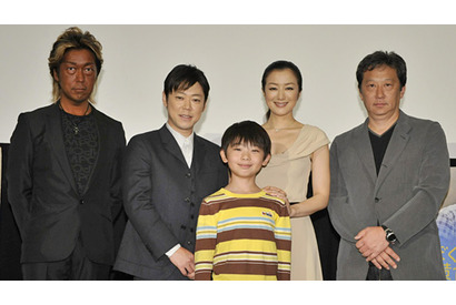 大好きな母親を訪ねて、横浜から瀬戸内海・小豆島まで、愛犬と共に500キロの自転車の旅に出る少年の姿を描いた、この夏の感動作『ぼくとママの黄色い自転車』。8月の公開に先駆けて、4月28日(火)、本作の完成披露試写会が行われ、主演の武井証と父母役の阿部サダヲ、鈴木京香の親子3人と共演の安部美央が揃って舞台挨拶に登壇した。