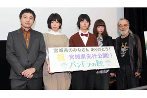 太宰治の同名小説を映画化した『パンドラの匣』が9月26日(土)、撮影が行われた宮城県で全国に先駆けて公開を迎え、仙台フォーラムにて染谷将太、川上未映子、仲里依紗、ミッキー・カーチスに冨永昌敬監督による舞台挨拶が行われた。宮城県南三陸町周辺でのオールロケが敢行された本作。この日の会場には本作に参加した大勢のエキストラも駆けつけ、アットホームな雰囲気の中で進められた。