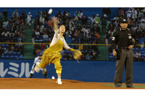 忽那汐里、始球式登板! 池松壮亮がしっかりと“愛のボール”を受け止める