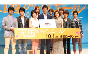 映画『天国からのエール』が10月1日(土)に公開を迎え、主演の阿部寛を始めミムラ、桜庭ななみ、矢野聖人、森崎ウィン、野村周平と熊澤誓人監督が舞台挨拶に登壇した。主人公のモデルとなった故・仲宗根陽さんの妻・美幸さんもゲストとして登場しキャストやスタッフへの感謝の思いを綴った手紙を朗読。劇場は深い感動に包まれた。