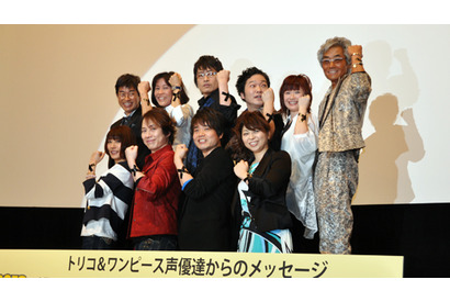 公開中の春休み映画『ジャンプHEROES film トリコ3D×ONE PIECE3D』に出演する声優の中井和哉、岡村明美、山口勝平、平田広明、大谷育江、山口由里子、矢尾一樹、チョー、置鮎龍太郎、朴路美の総勢10名が3月29日(火)、都内劇場で開催された舞台挨拶に登壇。ゾロやチョッパー、トリコなどの人気キャラクターの声で、震災からの復興を訴えるメッセージを発表した。