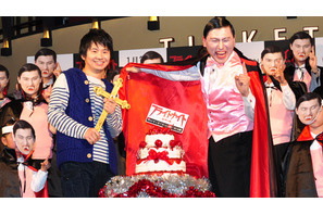 お笑いコンビ・オードリーの春日俊彰と若林正恭が3Dヴァンパイア映画『フライトナイト/恐怖の夜』の応援隊長に就任。12月21日(水)、都内劇場で開催されたイベントで“最狂ヴァンパイア軍団”を結成すると共に「トゥース!」ならぬ新ネタ「血ぃー吸うっ!」を披露した。