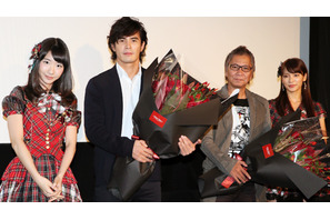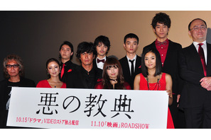 貴志祐介のベストセラーを鬼才・三池崇史の手で映画化した『悪の教典』、さらにその序章としてBeeTVドラマとして配信される「悪の教典-序章-」の完成披露試写会が10月10日(水)に都内で開催。主演の伊藤英明を始め、二階堂ふみ、染谷将太、林遣都、水野絵梨奈、KENTA、高岡早紀、原作者の貴志さん、三池監督が舞台挨拶を行なった。