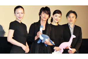 映画『リアル~完全なる首長竜の日~』の完成会見が作品にちなんで国立科学博物館(東京・上野)の首長竜(フタバスズキリュウ)の骨格のレプリカの前で開催。