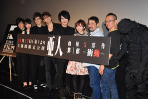 大人気漫画「亜人」の劇場版アニメの第1部『亜人 -衝動-』が10月28日(水)、東京国際映画祭でプレミア上映され、声優の宮野真守、細谷佳正、櫻井孝宏、平川大輔、小松未可子、洲崎綾に、総監督の瀬下寛之、安藤裕章監督が上映後の舞台挨拶に登壇した。