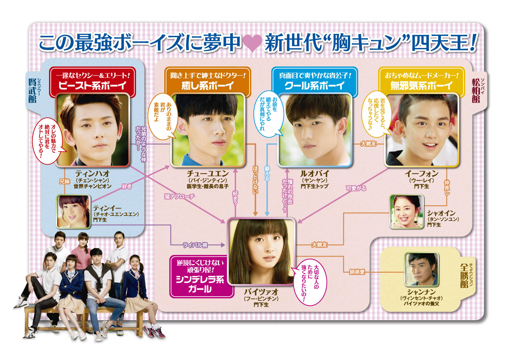 見どころは何と言っても、バイツァオを取り巻く男子たちのイケメンっぷり。硬派なルオバイ、押しの強いティンハオ、優しいチューユエン。三者三様のやり方で彼女に猛アプローチ!めくるめく四角関係が展開する。さらにルオバイのルームメイトでムードメーカーのイーフォンも加わり、真面目で健気だけど暴走しがちなバイツァオを全力でサポート。一体どうすればここまで素敵な男子たちに愛されるのか…もはや「羨ましい」の一言しかない。バイツォオから「尽くされる女」の極意を学びたいもの。全員武道家だけあって、一人の女性をめぐるバトルは正々堂々、とにかく爽やか。リスペクトと友情で結ばれていくイケメンなんて美しいに決まってます。
