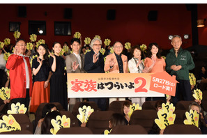人情喜劇のシリーズ最新作『家族はつらいよ2』の完成披露試写会が4月26日(木)、都内で行われ、橋爪功、吉行和子、西村雅彦、夏川結衣、林家正蔵、妻夫木聡、蒼井優、山田洋次監督…