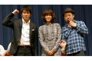 誰もが知ってるおとぎ話「赤ずきん」と思ったら、大間違い!! “いつかおとぎ話の世界から飛び出したい”と夢見る大人びた赤ずきん・レッドが元気いっぱいに大活躍する『リトル・レッド レシピ泥棒は誰だ!?』。10月6日(土)より公開される本作のプレミア試写会が9月27日(木)に開催され、上映前にレッドの日本語吹き替えを担当した上野樹里、オオカミ役の加藤浩次、そしてカエルの探偵・ニッキーを演じたケンドーコバヤシが舞台挨拶を行った。