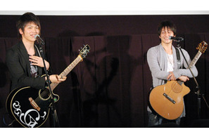 決して読んではならない「謎の書」が開かれたことで、前代未聞の妖精VS人間の全面戦争が幕を開けることに…。大人気のファンタジー小説「スパイダーウィック家の謎」を映画化した『スパイダーウィックの謎』が4月26日(土)よりついに公開。初日の舞台挨拶に、本作の日本版イメージソング「チェックメイト」(Tsubasa Recordsより4月30日発売/初回版1,365円<税込>、通常版1,155円<税込>)を歌う「遊吟」の卓と伸治が登場し、アコースティック・ギターでのミニライヴが行われた。