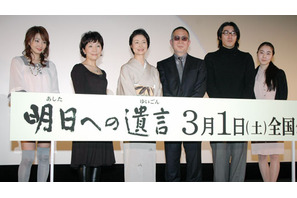 大岡昇平の「ながい旅」を原作に、戦後のアメリカ占領下での一人の日本人の誇り高き戦いと、彼を支え続ける家族の姿を描いた『明日への遺言』が3月1日(土)に公開初日を迎える。2月22日(金)に本作の特別試写会が開催。小泉尭史監督に富司純子、加藤隆之、近衛はなのキャスト陣、本作の主題歌を歌う森山良子、さらにスペシャルゲストとして、本作に強い感銘を受けたという眞鍋かをりも駆けつけ、舞台挨拶が行われた。