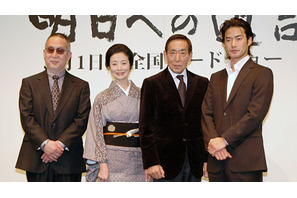B級戦犯として戦後、戦勝国アメリカに起訴された岡田資中将の、誇りを懸けた法廷での戦いを描いた『明日への遺言』。2月6日(水)、本作の特別試写会が開催され、上映前に舞台挨拶の主演の藤田まことと富司純子、小泉尭史監督、そしてスペシャルゲストとして、本作でナレーションを務めた竹野内豊が登壇した。